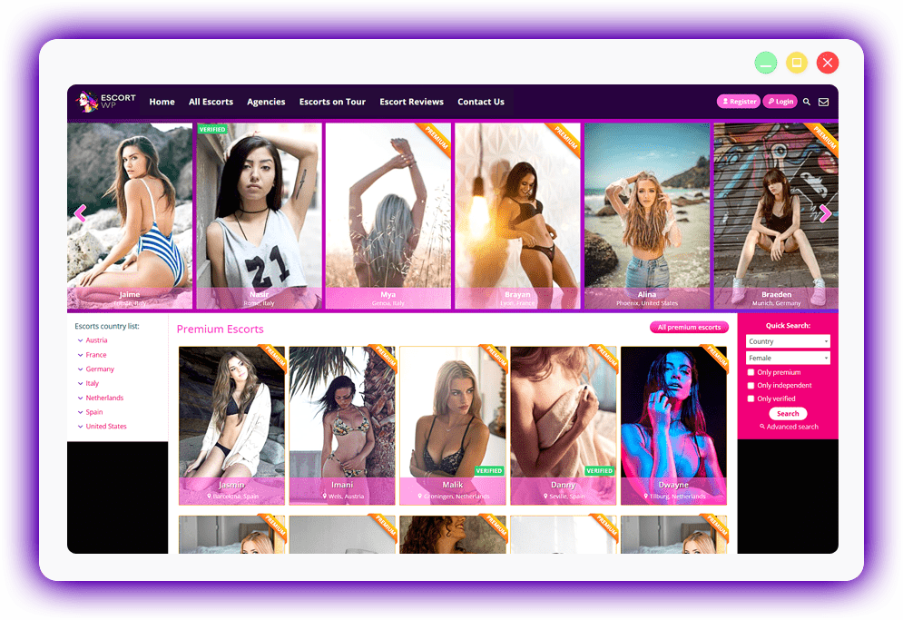 The theme has 3 user types: Agencies, Independent Escorts & Members. The agency and escort profile names are customizable so you can choose any name you want for them. You can also chose the url structure for the profile pages. This means you can use the theme for other types of directories: photo-models, cam-models, massage parlors etc.